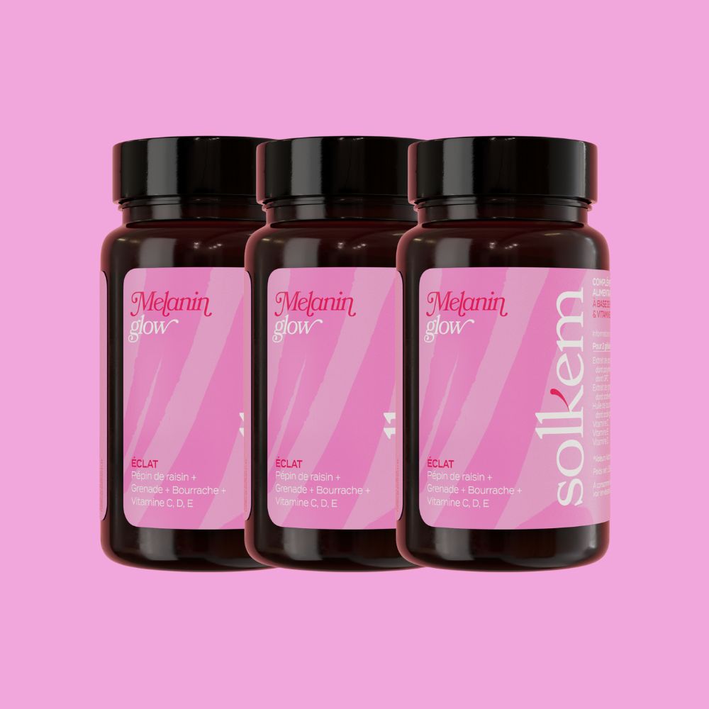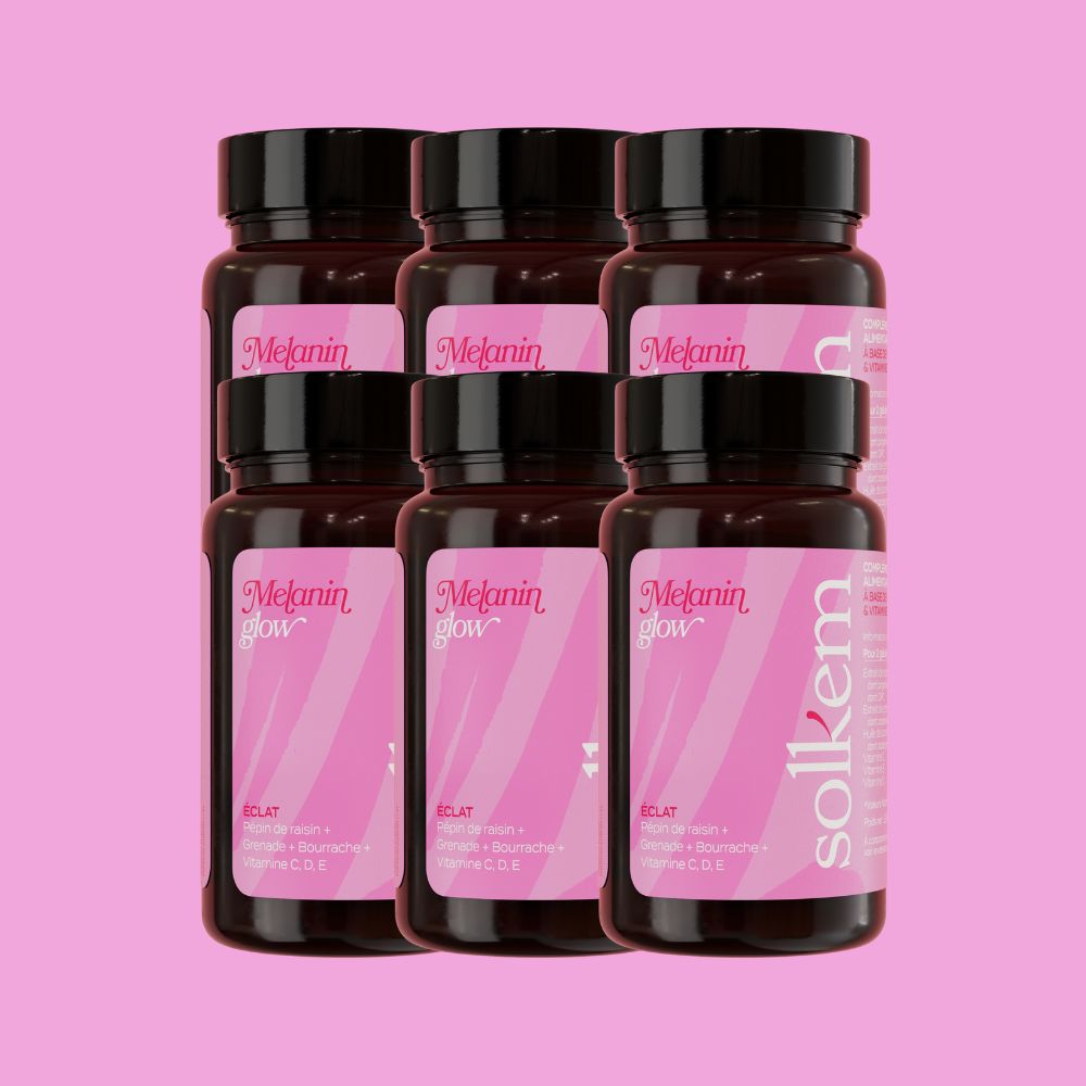 Melanin Glow® contient quatre super-ingrédients anti-oxydants reconnus pour leurs actions contre l'hyperpigmentation : l’extrait de pépin de raisin, le SOD de melon, l'extrait de grenade et la vitamine C.