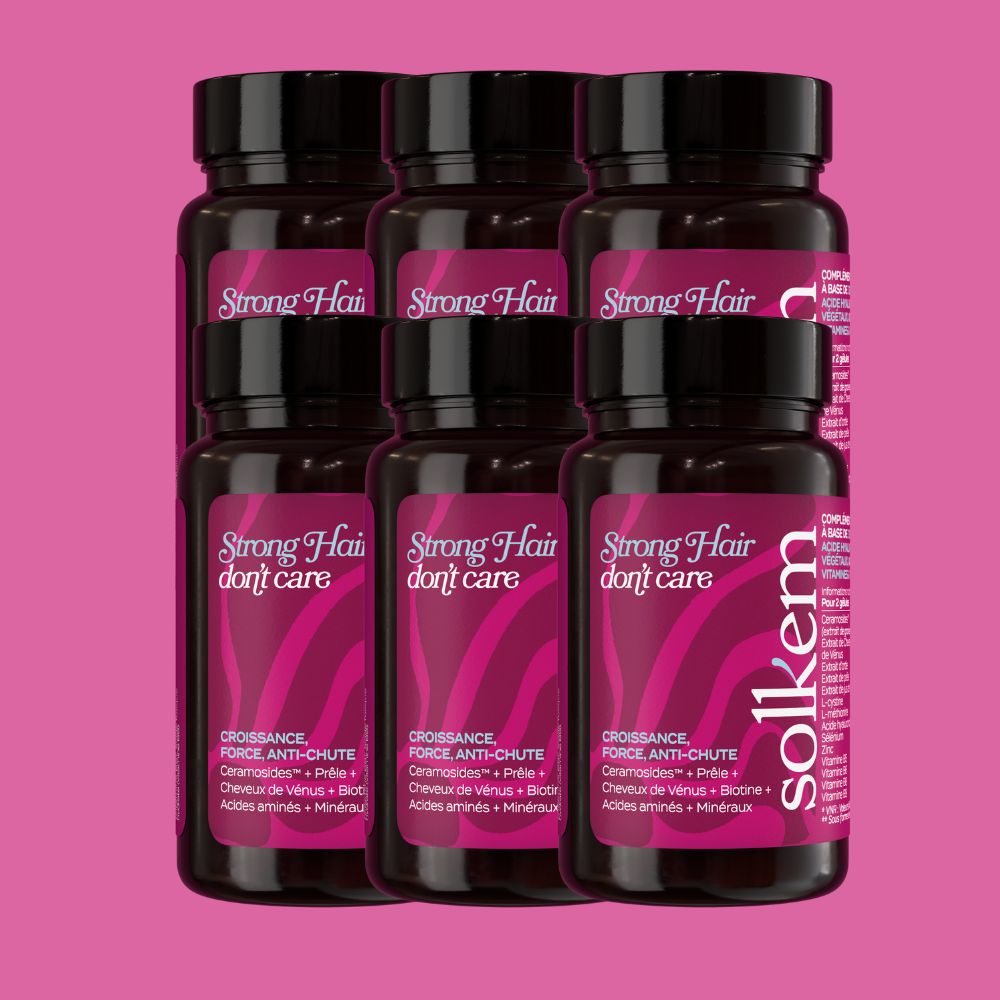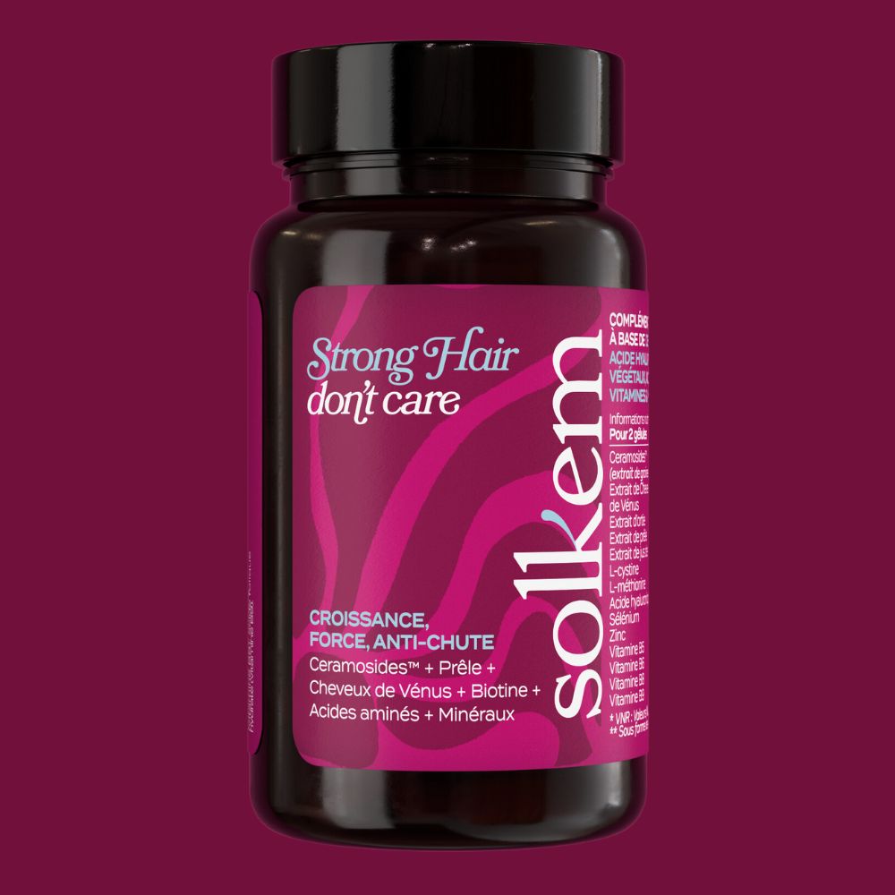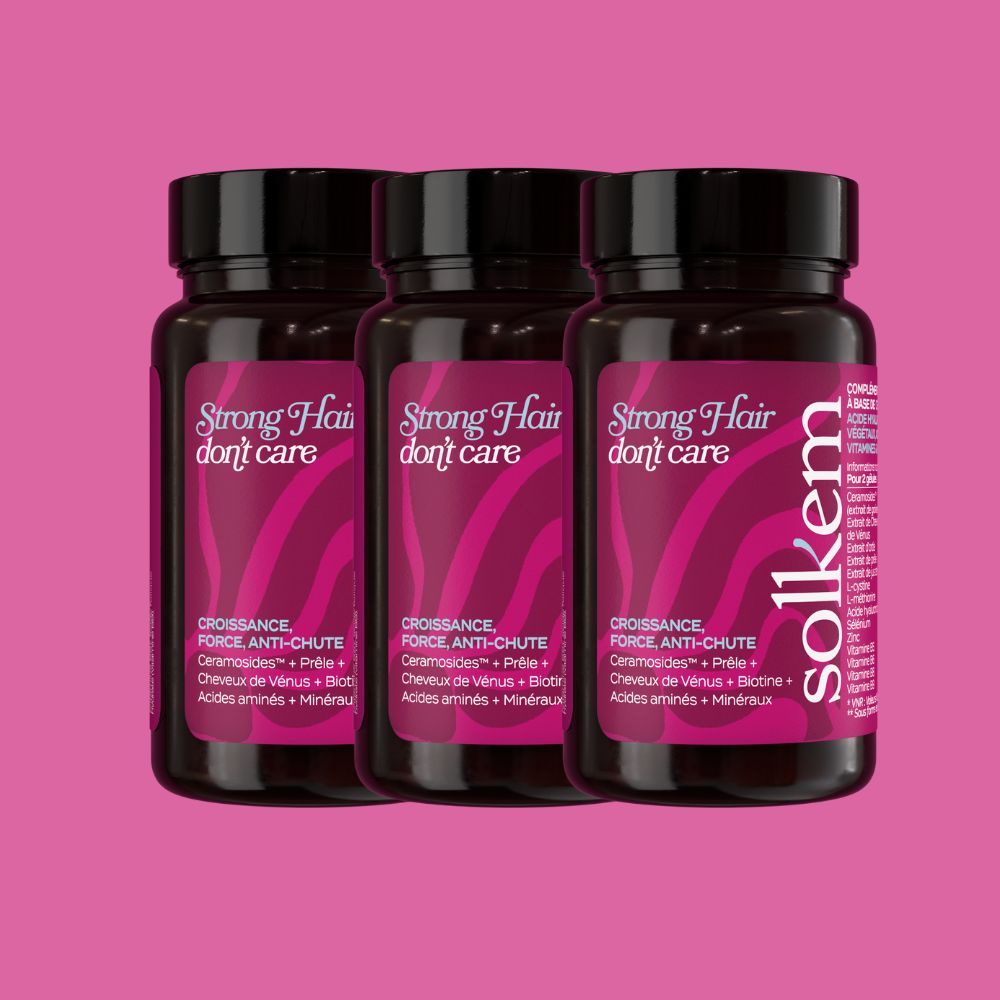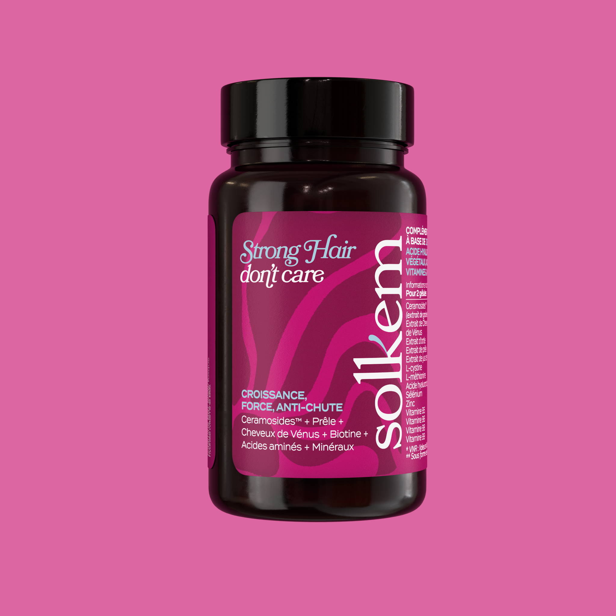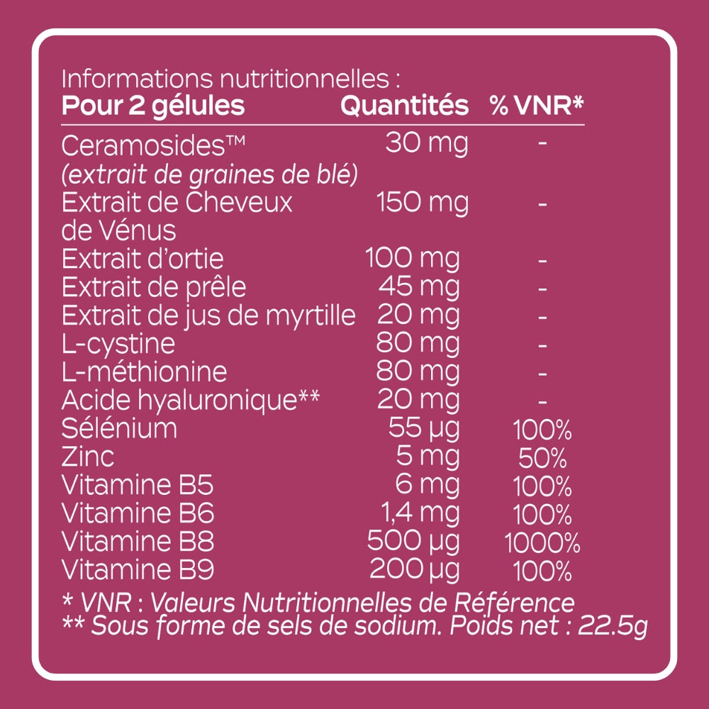 Liste complète des ingrédients : extrait sec de parties aériennes de Cheveux de Vénus (Adiantum capillus-veneris), agent d’enrobage : hydroxypropylmethylcellulose, extrait sec de parties aériennes d’ortie piquante (Urtica dioica), L-cystine, L-méthionine, extrait sec de prêle des champs (Equisetum arvense), Ceramosides™ (extrait sec de graines de blé), sélénium sur levure, hyaluronate de sodium, extrait sec de baie de myrtille (Vaccinium myrtillus), poudre de fibre de pomme, bisglycinate de zinc, pantothénate de calcium (vitamine B5), chlorhydrate de pyridoxine (vitamine B6), biotine (vitamine B8), acide folique (vitamine B9).